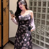 【法式V領碎花吊帶裙】 復古收腰顯瘦印花氣質甜美吊帶連衣裙防開衫兩件套