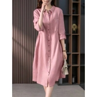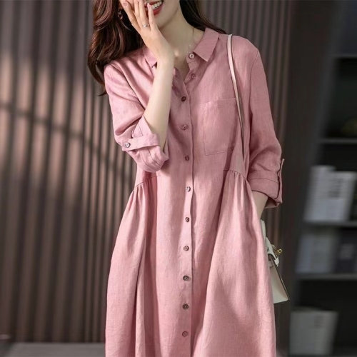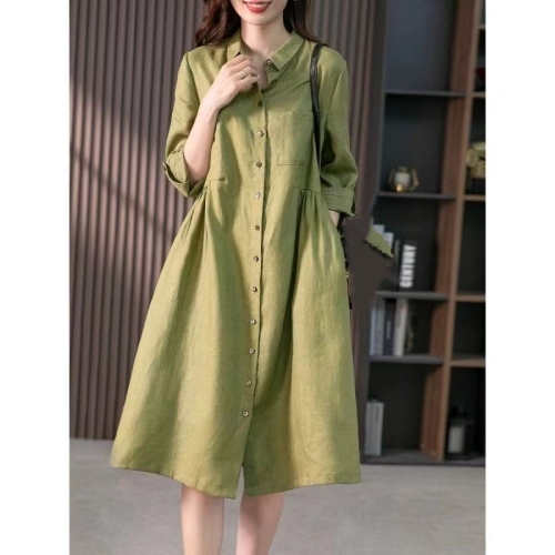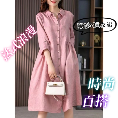法式亞麻寬鬆連衣裙 純色開扣設計 簡潔幹練 亞麻面料 清爽透氣 不挑身材 不挑年齡