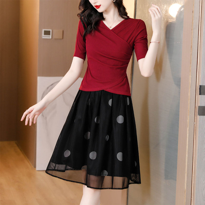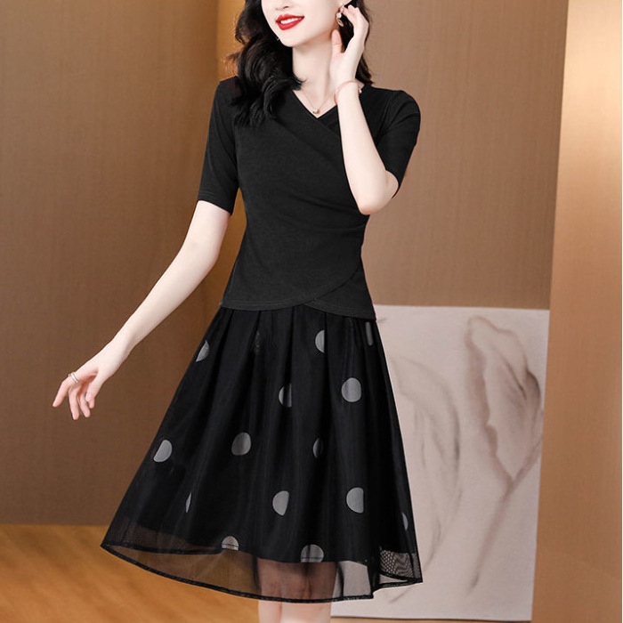 波點半身裙兩件套裝 高級感法式短袖 短袖裙子套裝 穿上減齡顯高顯瘦顯年輕 展現你優雅知性的獨特魅力 時尚好搭配 不易變形輕薄舒適
